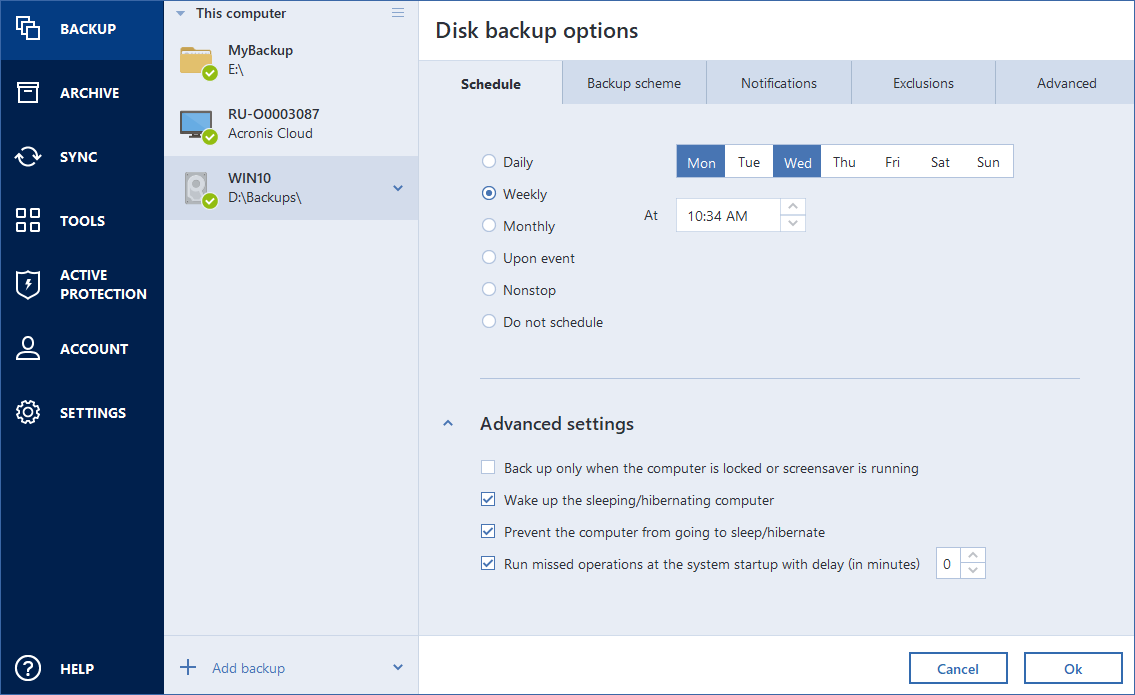Do not schedule—The scheduler will be turned off for the current operation. In this case the backup or validation will run only when you click Back up now or Validate respectively in the main window.