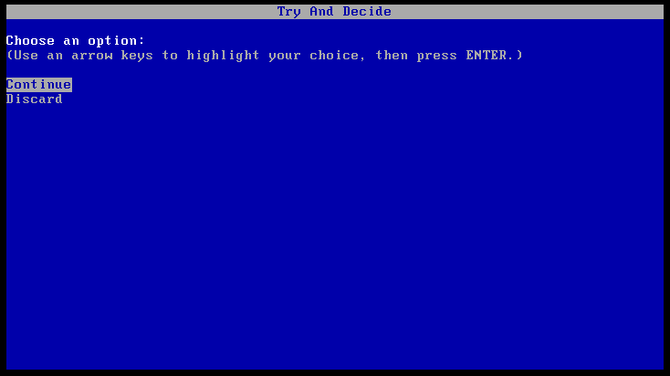 When your computer reboots for whatever reason while working in the Try mode, before booting of the operating system starts, you will be shown a dialog offering you two choices – stop the mode and discard changes or continue working in the mode. This will allow you to discard the changes that have resulted in a system crash. On the other hand, if you reboot, for example, after installing an application, you can continue working in the Try mode after starting Windows.