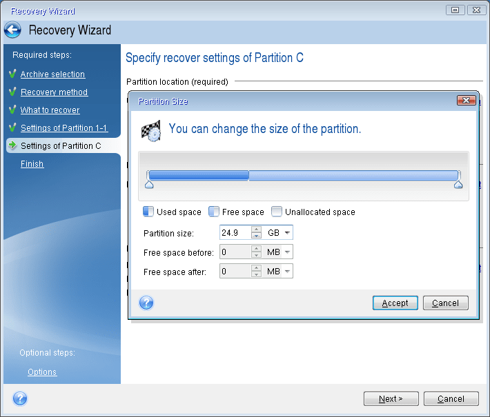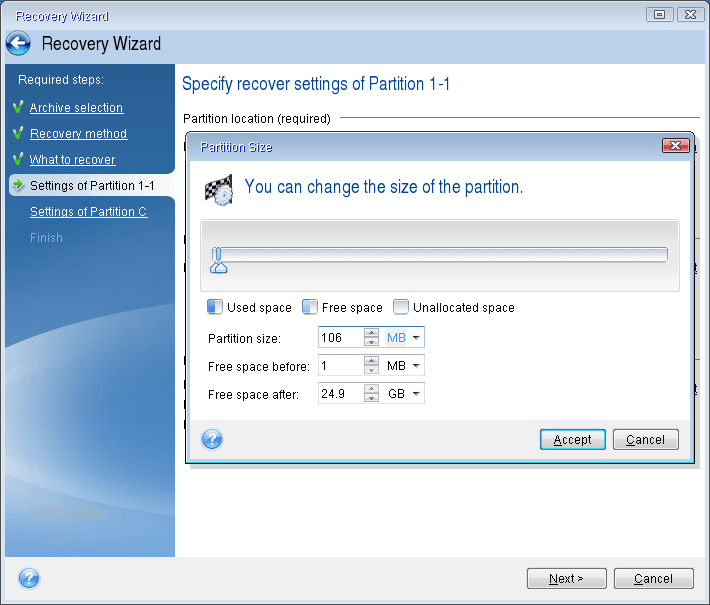 - Size—Click Change default in the Partition size area. By default the partition occupies the entire new disk. Enter the correct size in the Partition size field (you can see this value on the What to recover step). Then drag this partition to the same location that you saw in the Backup Information window, if necessary. Click Accept.