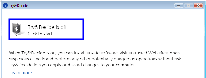 To start the Try mode, click the Try&Decide icon. The program starts tracking all changes made to the OS and files and temporarily stores all the changes on the selected disk.