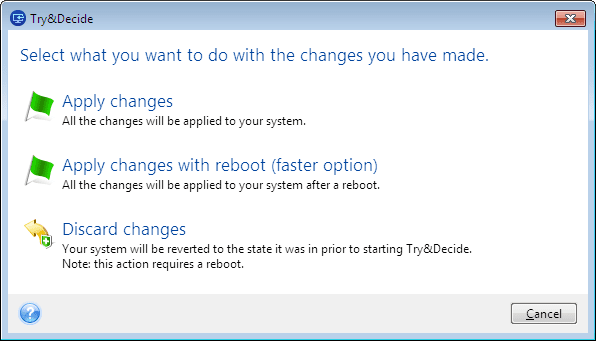 - Select Discard changes if you want to return your system to the state it was in prior to turning on the Try mode. When you select this option, a pop-up window is displayed with the following options: Reboot to discard changes and Do not reboot. If you select the Do not reboot option, the Try&Decide feature remains on, and the changes will not be discarded.