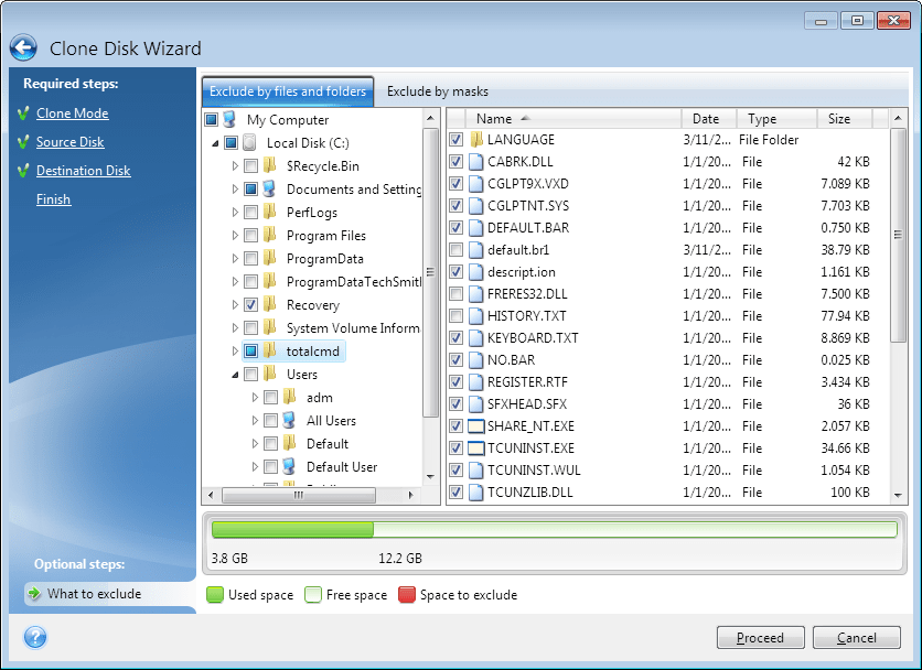 If you do not want to clone specific files from a source disk (for example, when your target disk is smaller than the source one), you can opt to exclude them in the What to exclude step.