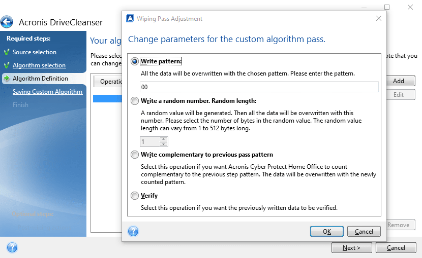 Each line defines an operation that will be performed during a pass. To create your algorithm, add as many lines to the table that you think will be enough for secure data destruction.