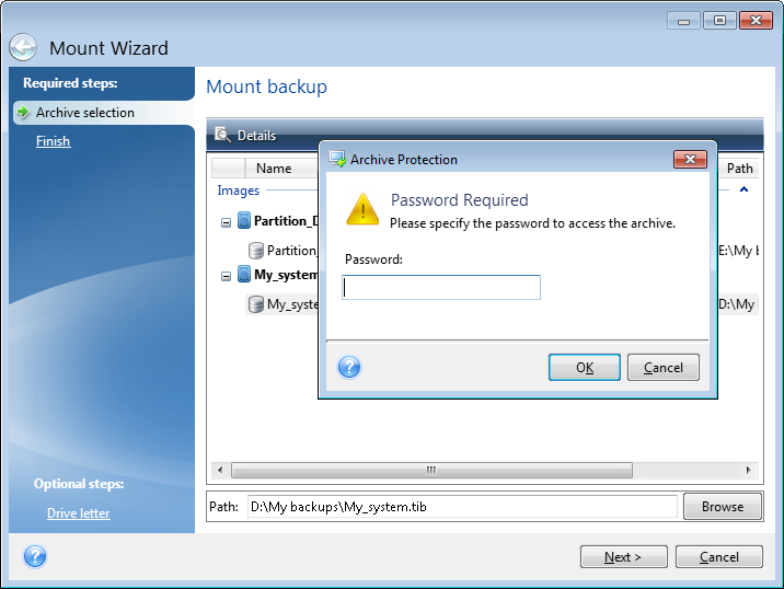 If the backup was password-protected, Acronis True Image Home 2012 will ask for the password in a dialog box. Neither the partitions layout will be shown, nor will the Next button be enabled until you enter the correct password.