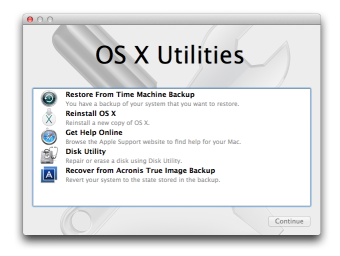 Choose Acronis Media as a device to boot from. The OS X Utilities list is displayed.