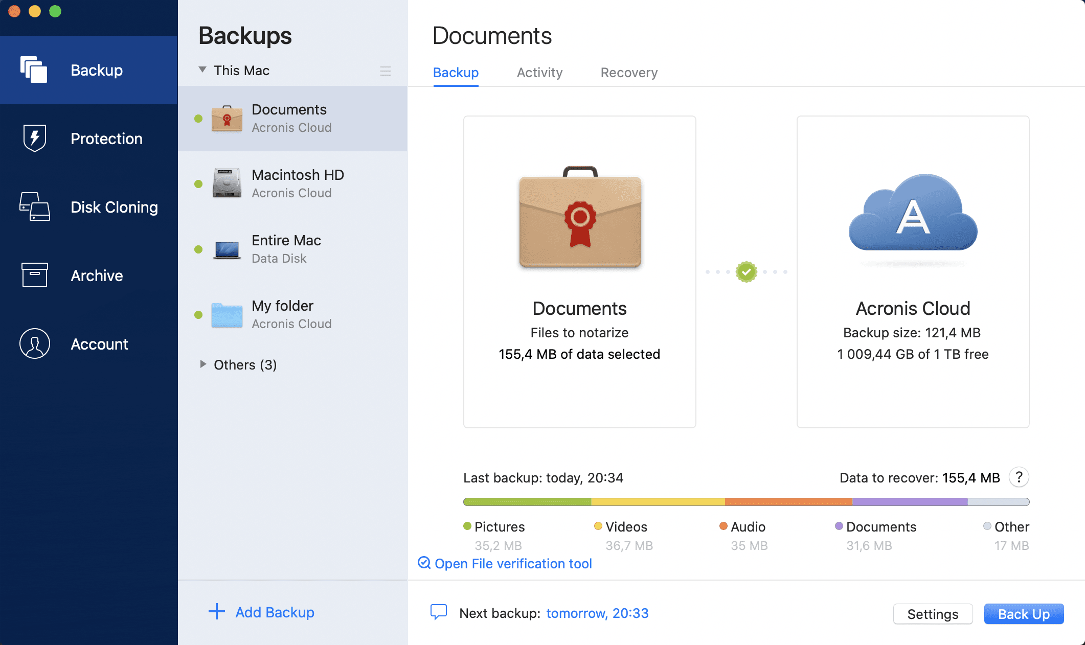 By using Blockchain technology, Acronis Cyber Protect Home Office can protect your files from unauthorized modification. This gives you a guarantee that you can recover your data from the same file that was backed up. We recommend that you use this type of backup to protect your legal document files or any other files that require proved authenticity. Refer to Using Blockchain technology for details.