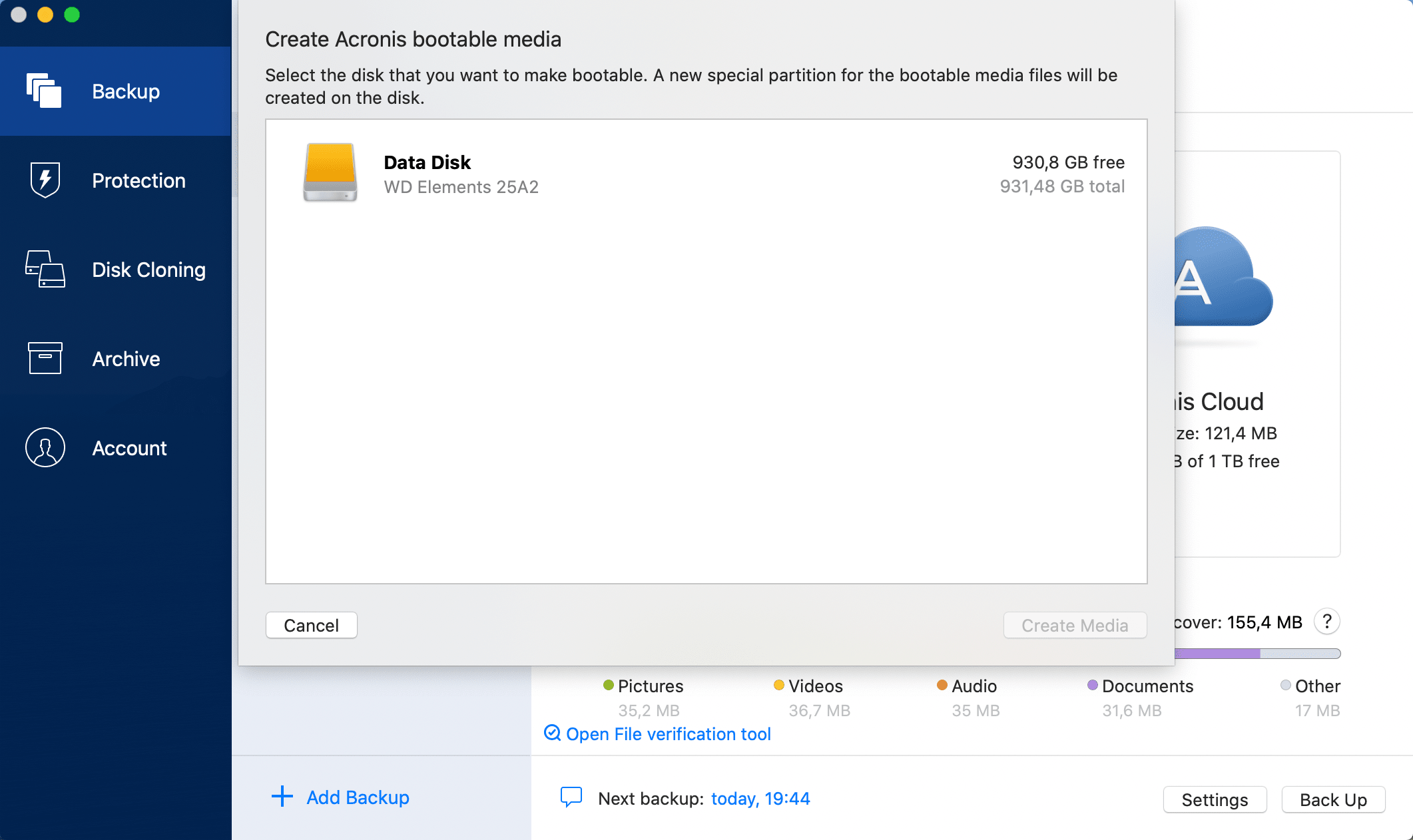 - In the File menu, click Create Acronis Bootable Media. In the opened window, click Create Media.