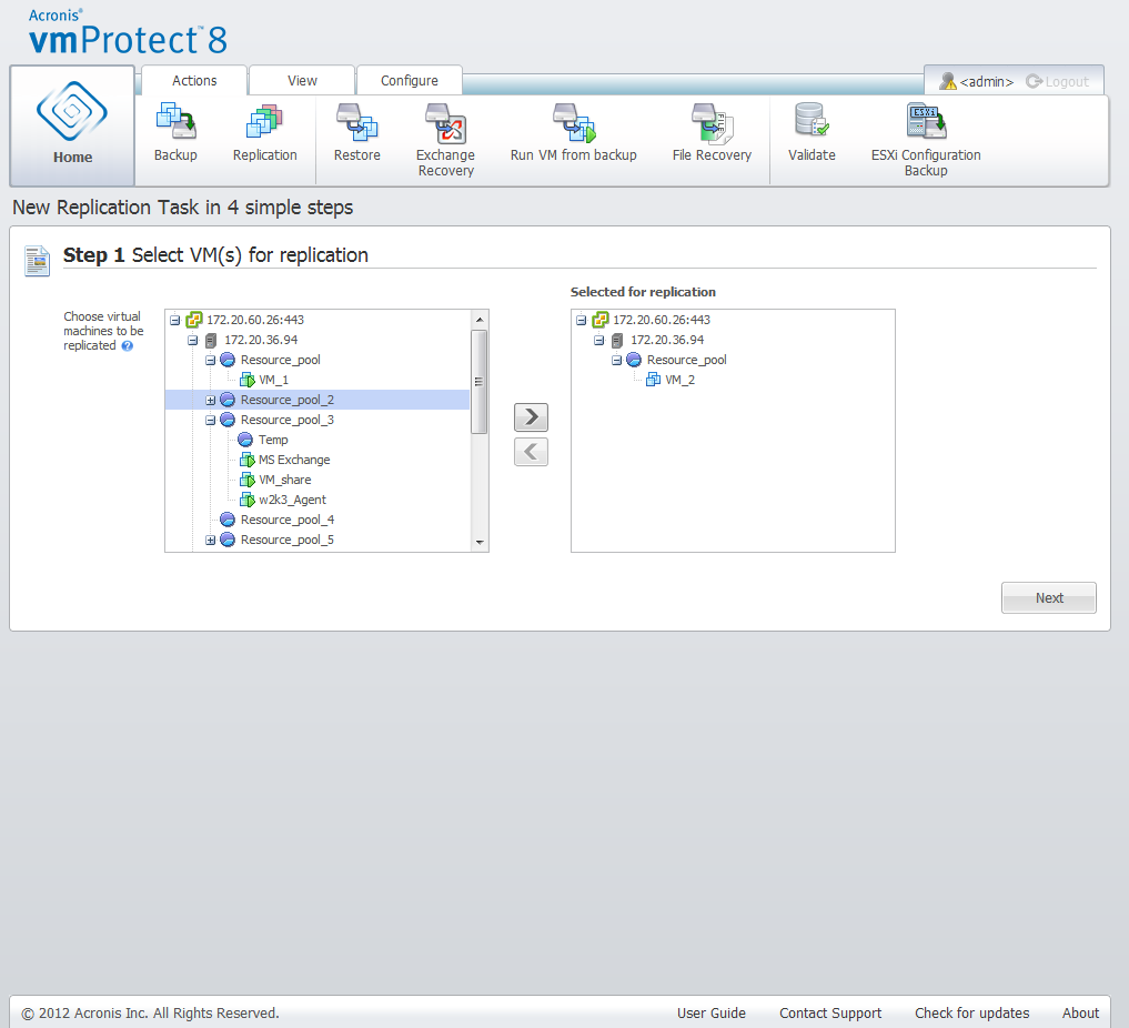 In the first step of the New Replication Task wizard you should select the virtual machine(s) you want to replicate. The left side shows all of the ESX(i) hosts/vCenter you have which are managed by Acronis vmProtect 8 Agent and a list of their virtual machines. If you don’t see the exact virtual machine to be replicated in this list, make sure that you have added the corresponding ESX(i) host from the Configure->ESX(i) Hosts page.