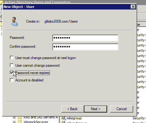 Password never expires: Ensure that User must change password at next logon is not selected. Typically, in the enterprise, the User cannot change password and Password Never Expires fields should be selected.
