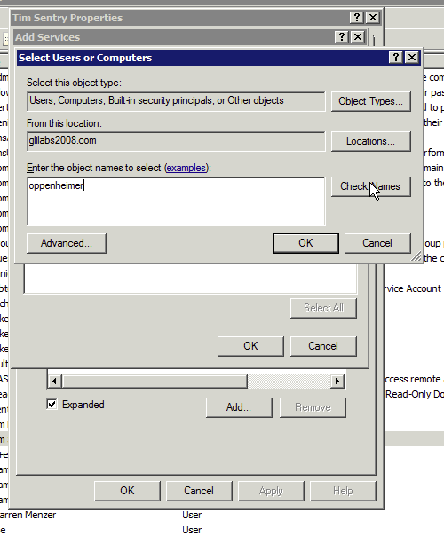 Find and select the Kerberos user account that you created in "Create a Kerberos Service Account".