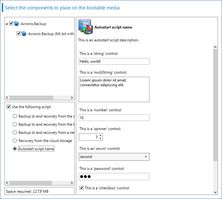 The sample autostart.json below contains all possible types of controls that can be used to configure variables for <script_file>.sh.