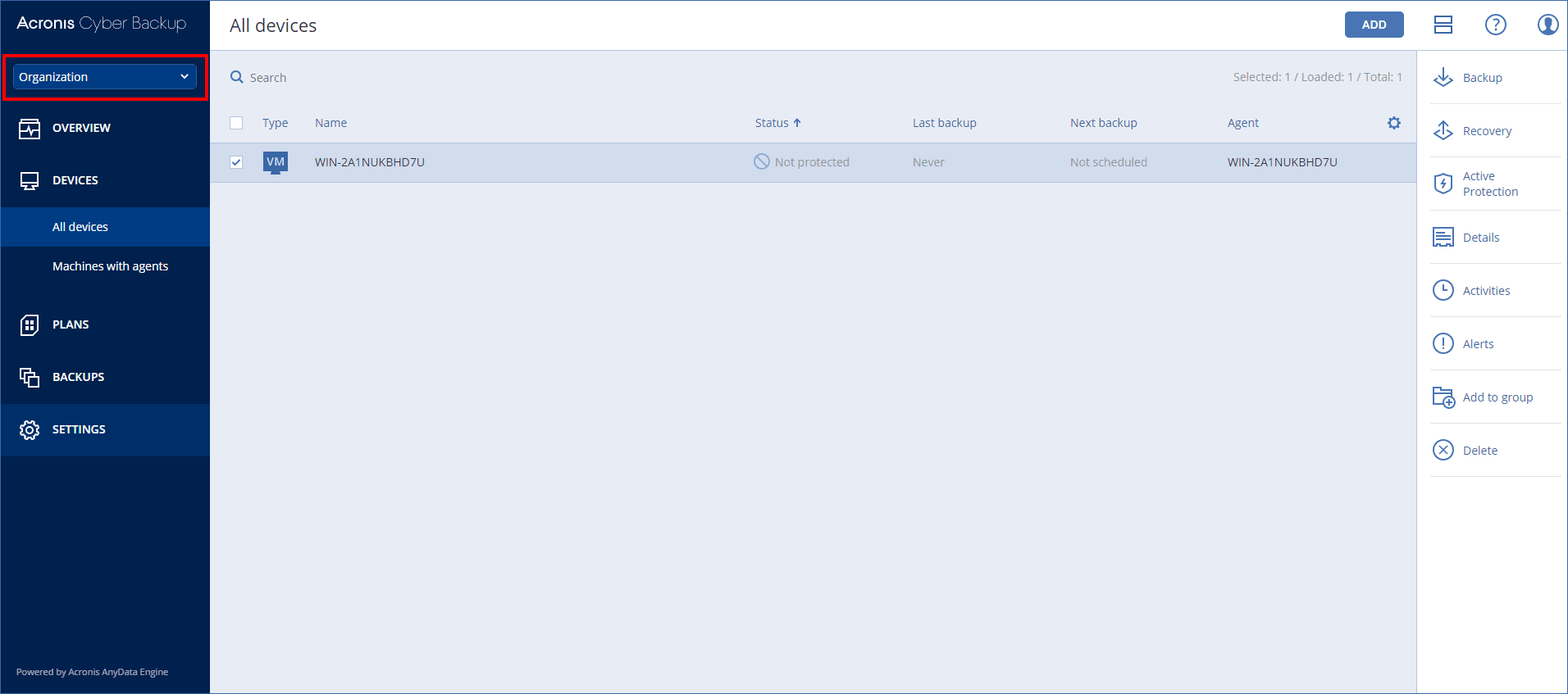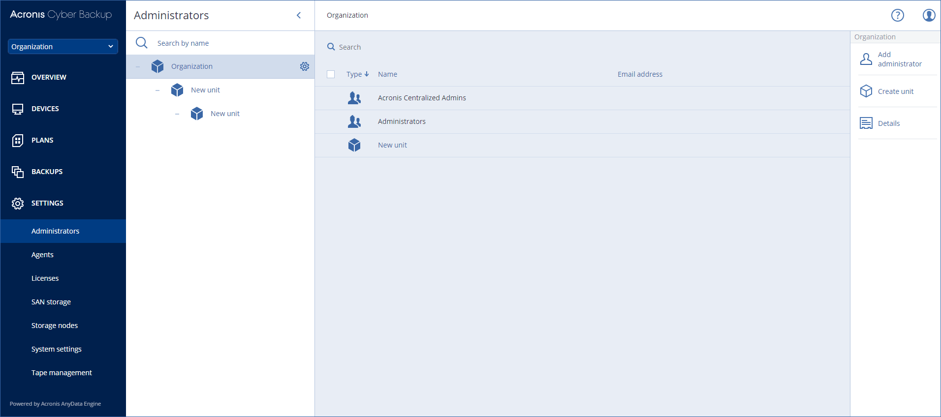 The Organization group is automatically created when you install the management server. With the Acronis Cyber Backup Advanced license, you can create child groups called units, which typically correspond to units or departments of the organization, and add administrators to the units.