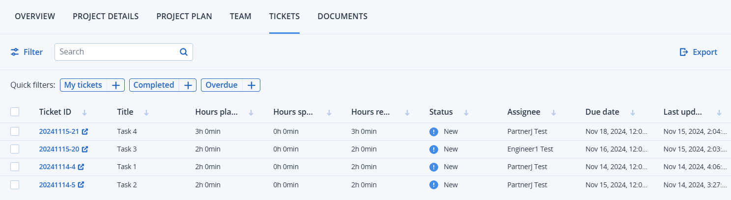All project tickets are displayed in the Tickets tab of the relevant project. In this tab, you can see the status of each ticket (which is also the status of the project step), the hours already spent on the ticket, the team member assigned to the ticket, and when the ticket was last updated. For more information about tracking time and work in the ticket itself, see Viewing and editing a project ticket.