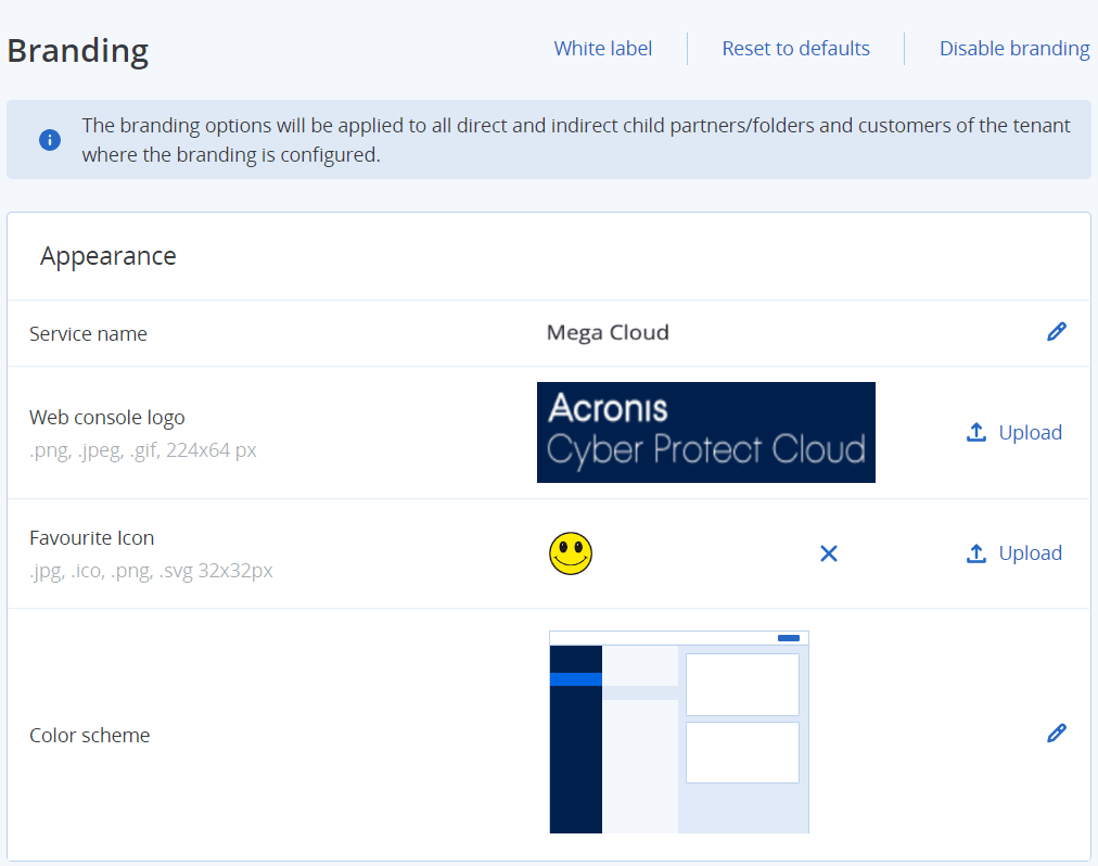 The Settings > Branding section enables partner administrators to customize the user interface of Management Portal and the Cyber Protection service for their child tenants to remove any association with the higher-level partners.
