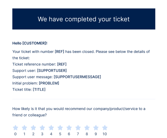 When the customer receives the ticket rating request email, they can rate the ticket by clicking on the relevant star rating. When clicked, they can also add comments.