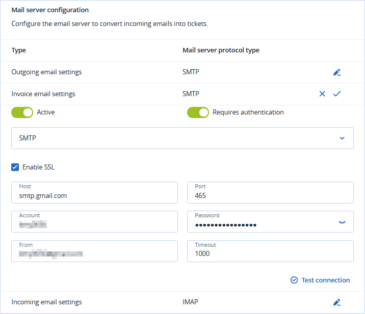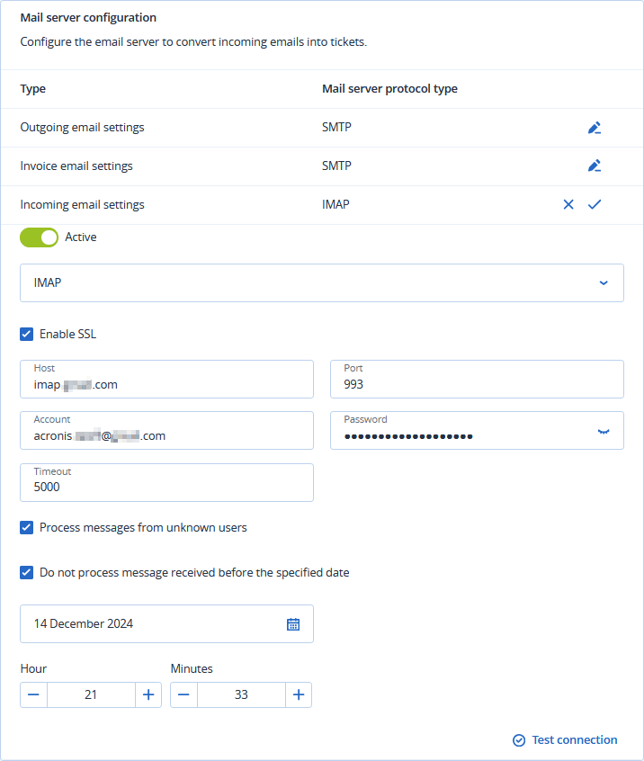 Click Test Connection to verify your incoming email settings.