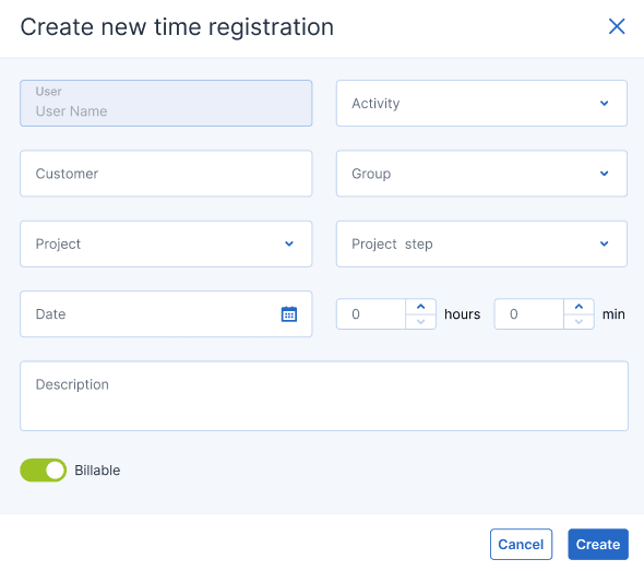 When creating a new time registration, the User field is automatically filled with your name.