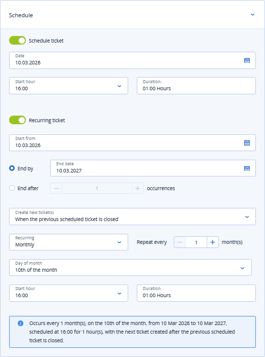 Click the Schedule section to schedule the ticket and to define a recurring schedule for it.