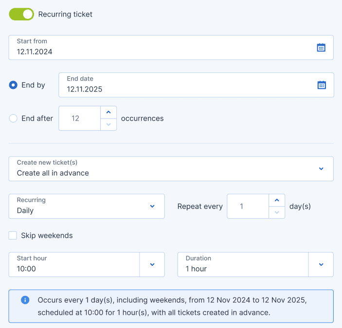 - Click the Recurring ticket option switch to enable it.