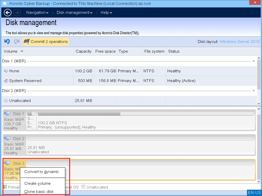 With a full-featured Linux-based bootable media, you can clone basic MBR disks. Disk cloning is not available in the ready-made bootable media that you can download or in a bootable media that is created without a license key.