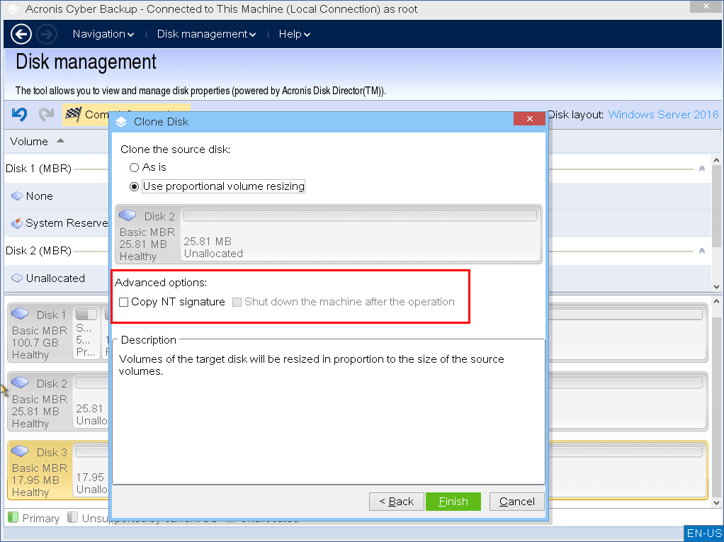 If you are cloning a disk comprising a system volume, you need to retain the operating system bootability on the target disk volume. It means that the operating system must have the system volume information (for example, volume letter) matched with the disk NT signature, which is kept in the MBR disk record. However, two disks with the same NT signature cannot work properly under one operating system.