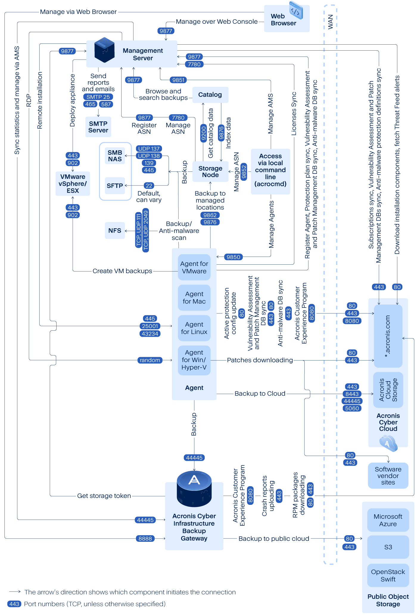Visit our Knowledge Base for a list of ports, services, and processes that Acronis Cyber Protect uses: