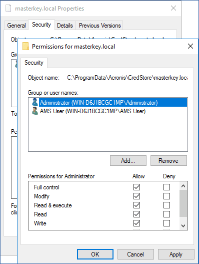 Navigate to %ProgramData%\Acronis\AMS\AccessVault\config, and then grant the Administrator user account Full control permissions for the following files: