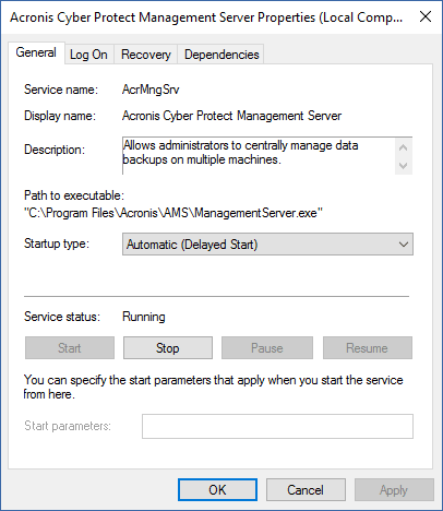 Set the startup type of Acronis Cyber Protect Management Server to Automatic (Delayed Start) and the startup type of all other Acronis services to Automatic.
