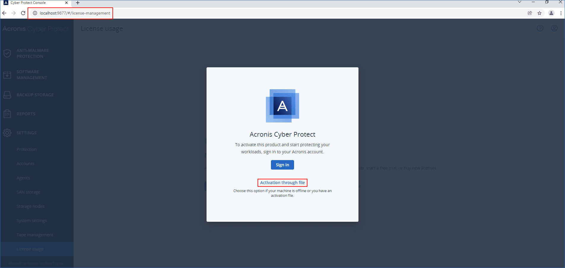 After installing Acronis Cyber Protect management server, open the local console (https://<IP>:<port>).