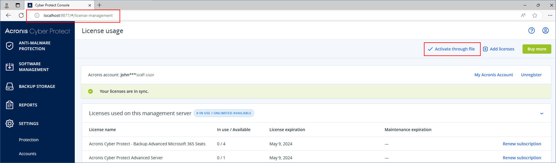 If this offline management server is the only management server in your environment, the licenses in your Acronis account will be automatically allocated to it. The activation file will contain this information, so no additional allocation is required.