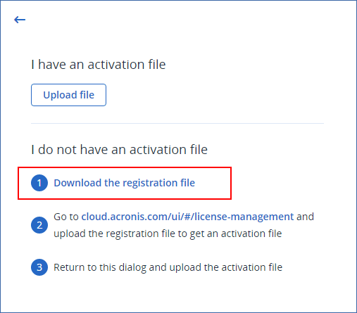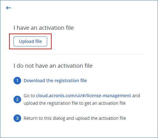 Under I have an activation file, click Upload file, and then select the activation file that you downloaded from the cloud console.