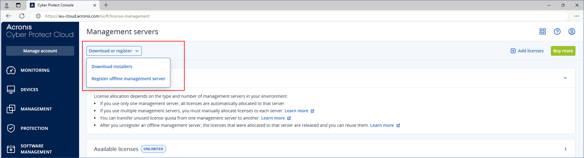 - On the machine that is connected to the Internet, log in to the cloud console (https://cloud.acronis.com), and then go to Settings > Management servers.