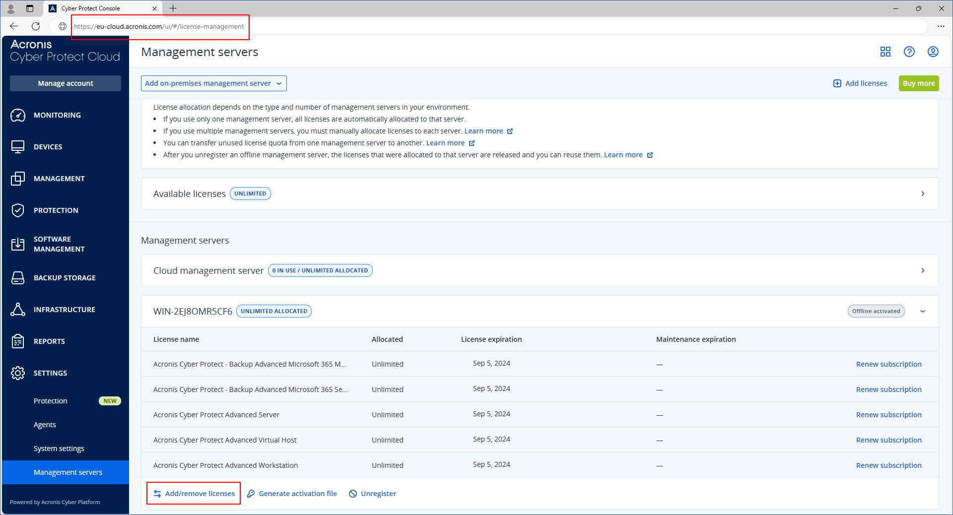 - In the cloud console (https://cloud.acronis.com), click Settings > Management servers.