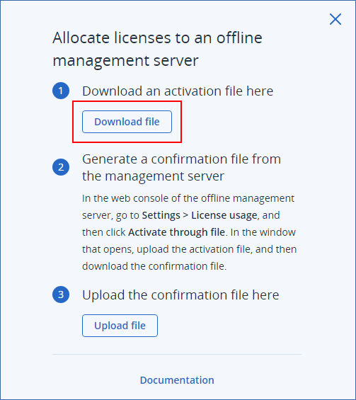 In the Allocate licenses to an offline management server dialog, click Download file.