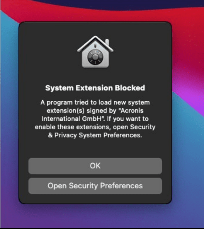 - The "System Extension Blocked" warning will appear on the protected workload. Click Open Security Preferences.