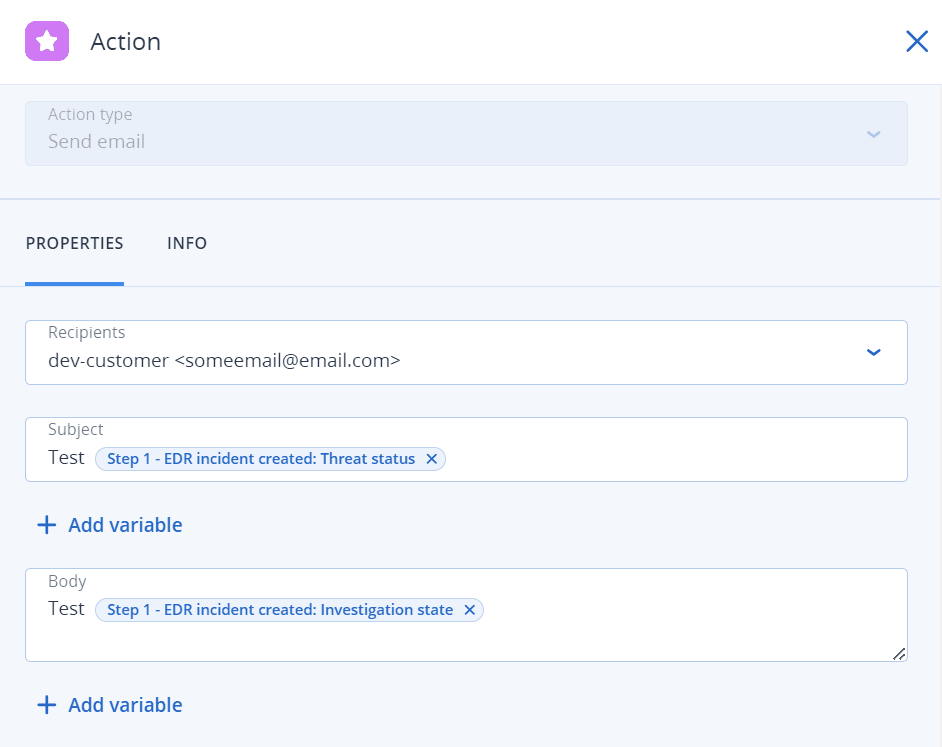 For example, click the action Send email, and then modify the selected recipients, body, and subject of the email that is sent as part of this workflow.