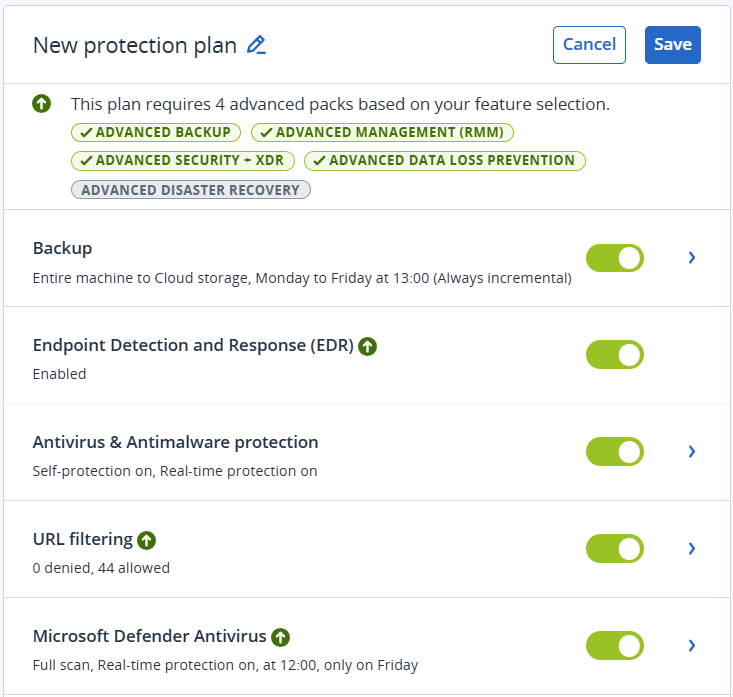 The Advanced Security + XDR pack icon, as shown below, is added to the list of protection packs required for the implementation of the protection plan, depending on additional packs you select.