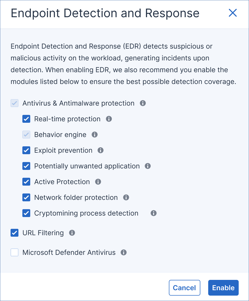In the displayed dialog, click Enable. Note that you can enable EDR and still disable any of the Antivirus & Antimalware, Active Protection and URL filtering functionality in the protection plan.