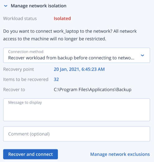 6. [Optional] In the Message to display field, add a message to display to end users when they access the connected workload. For example, you can inform users that a backup was restored to the workload and that network access in and out of the workload is resumed.