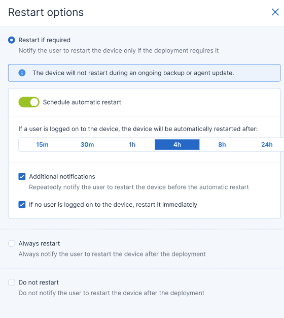 If no user is logged on to the device, restart it immediately This option is available if you selected Schedule automatic restart.