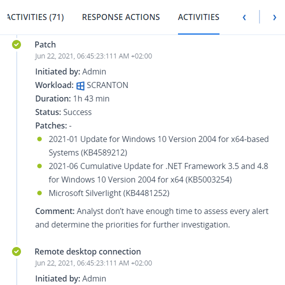 To get a complete understanding of what actions were applied and why, you may need to scroll through the applied response actions for the node. For example, for remote desktop connection actions, you can view who started the action and when, the duration of the action, and its overall status (if it succeeded, failed, or succeeded with errors).