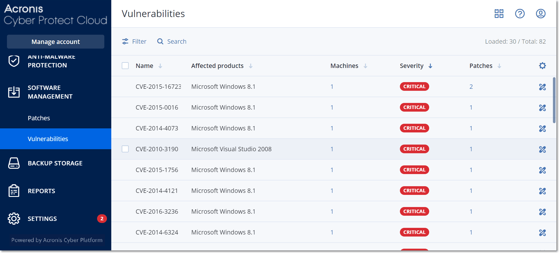 - In the Cyber Protect console, go to Software management > Vulnerabilities.