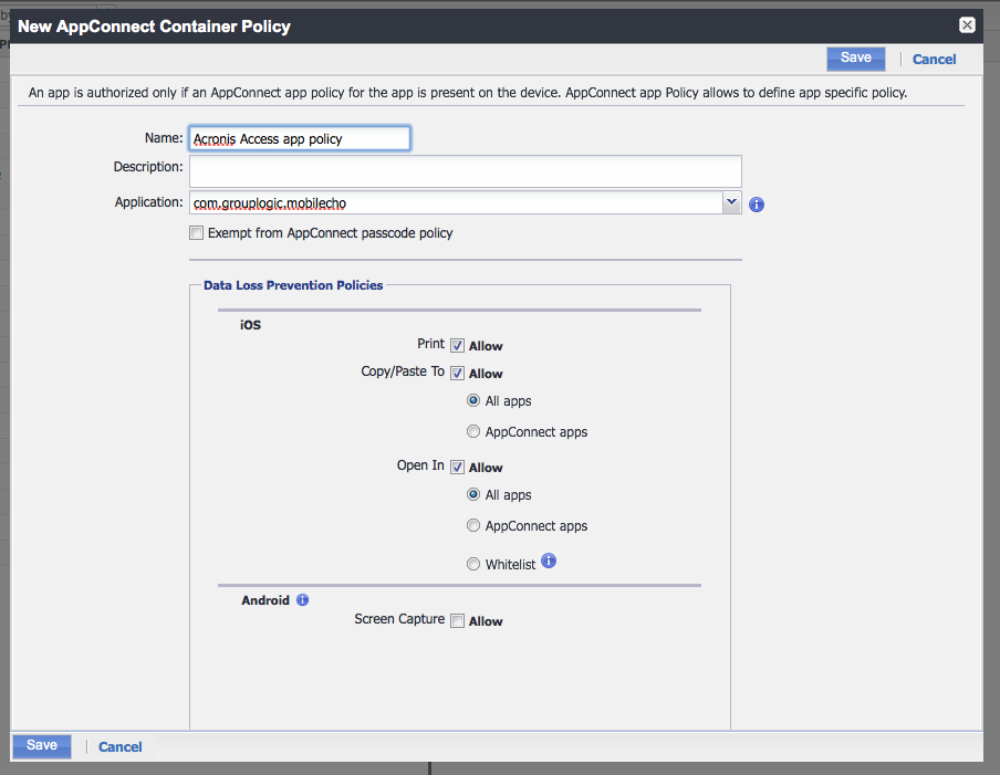 Policies: Set whatever MobileIron policies you want to use for managing Files Advanced.