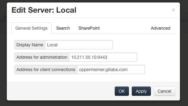 URL Wildcard: The URL that the client will try to contact the Files Advanced Gateway server on. This must match the "Address for client connections" configured for the Gateway server in the Files Advanced admin interface. This can be a regular expression to match multiple gateways but for the purpose of this document we will enter the exact hostname.*