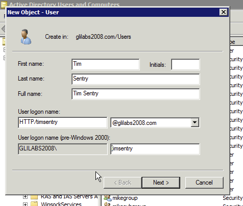 Enter a Name and a User Logon Name for the Kerberos service account. Use standard alphanumeric characters with no whitespace for the User Logon Name, as it is entered in a command prompt later in the guide. The name must start with HTTP/. If HTTP/ automatically appears next to the User logon name (pre-Windows 2000) field, delete it from that field.