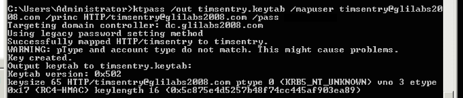 E.g. ktpass /out timsentry.keytab /mapuser timsentry@glilabs2008.com /princ HTTP/timsentry@glilabs2008.com /pass 123456