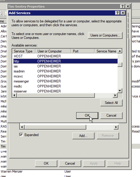Find and select the Kerberos user account that you created in "Create a Kerberos Service Account".