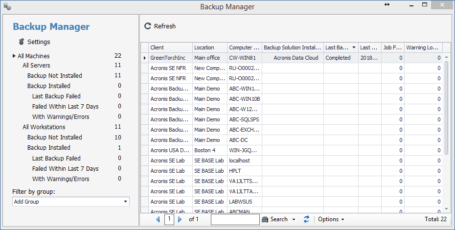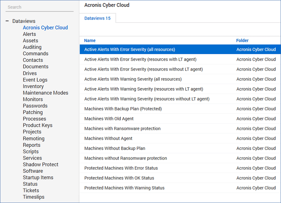 The Acronis plugin installs the dataviews that sort the Acronis Cyber Protect Cloud statistics by the following criteria: