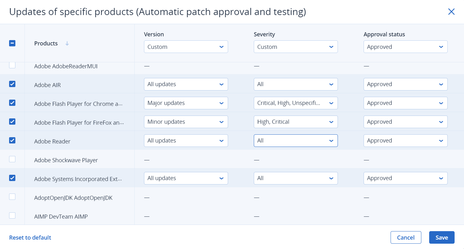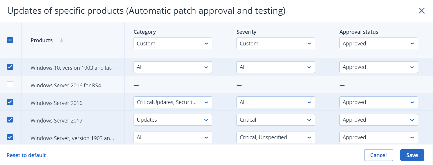 If you want to update specific products, for each product you can define which updates to install by category, severity, or approval status.