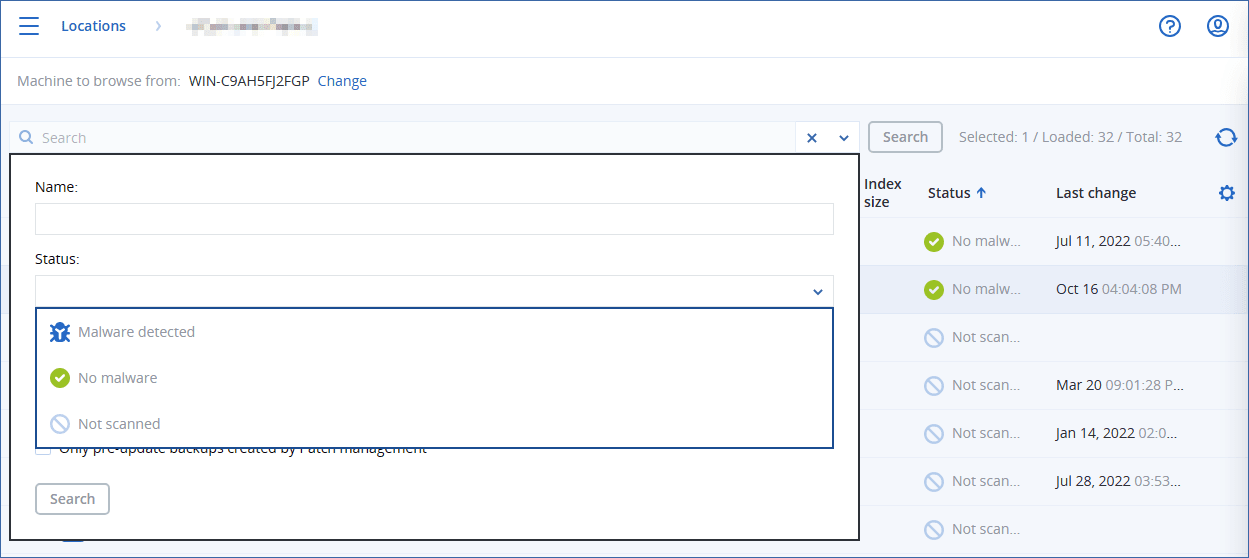 During a safe recovery operation, the backup is automatically scanned for malware. Then, the protection agent recovers the backup on the target workload and deletes any infected files. As a result, a malware-free backup is recovered.